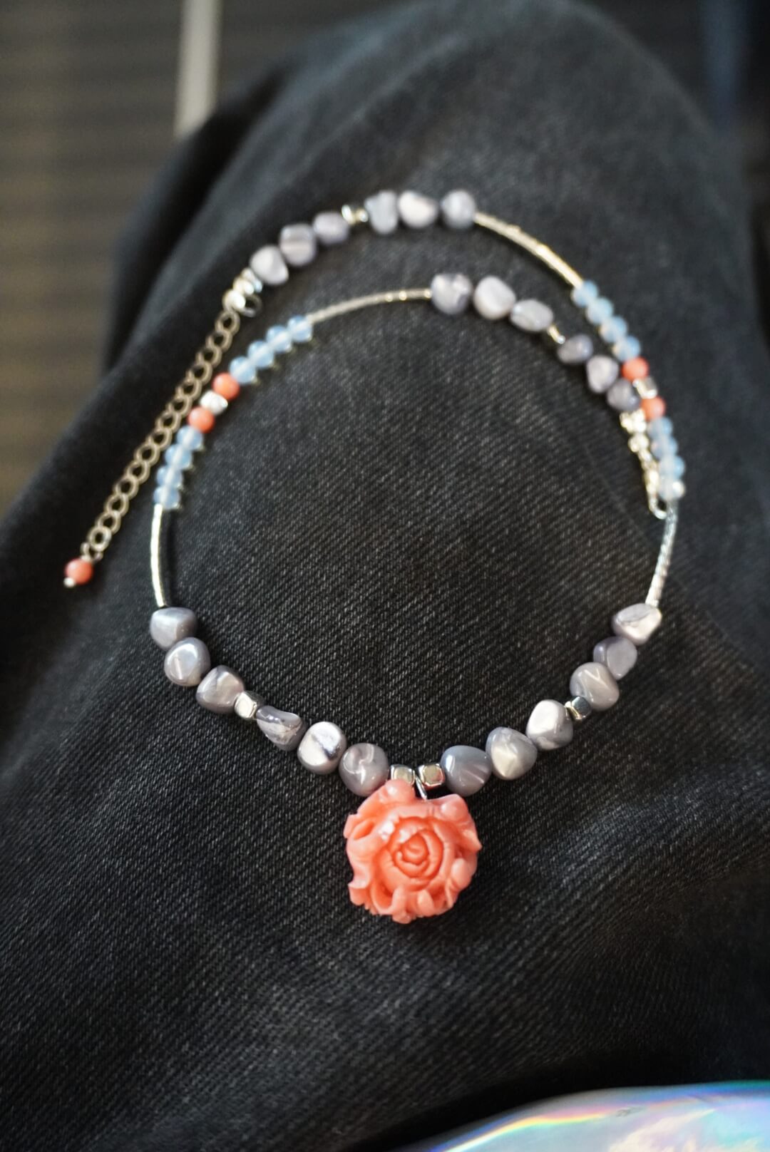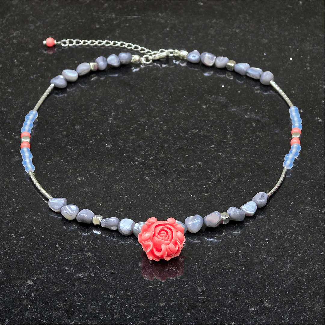 Add a touch of elegance to your style with the Coral Sunset Choker. This handmade gemstone choker features genuine coral, mother of pearl, and opalite beads. Its warm, earthy tones capture the beauty of a sunset, making it a timeless addition to any jewelry collection.
