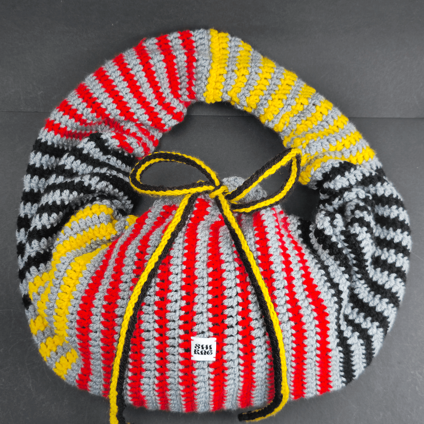 Bold handmade crochet sling bag in lava-inspired red, yellow, black, and gray stripes. Soft, stretchy, and one of a kind. The ultimate caterpillar-core statement piece.
